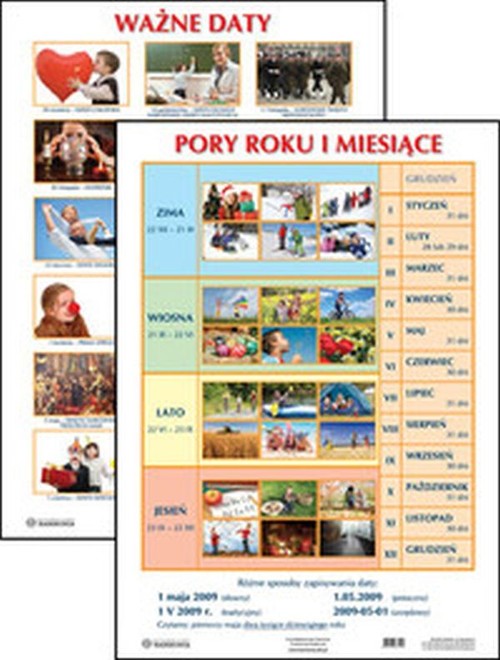 Prezentujemy Państwu plansze edukacyjne dla przedszkoli i klas 1-3. Jest to zestaw pomocy dydaktycznych, które przydadzą się w każdej klasie i sali przedszkolnej. Tematyka plansz jest zgodna z programem nauczania i dotyczy rzeczy bliskich dziecku. Dzięki wyrazistym ilustracjom i zdjęciom tablice w przyjazny sposób przedstawiają realia naszego świata. Poszczególne wzory sprawdzą się w dekorowaniu klasy lub pokoju dziecka, zwłaszcza jeśli ma już ono swoje zainteresowania. Opanowanie nazw wszystkich miesięcy w kolejności nie jest dla dziecka łatwe. Na planszy przedstawiono je tak, by pokazać, jakie miesiące składają się na poszczególne pory roku i jakie wydarzenia się z tymi porami łączą. Starszym dzieciom przydadzą się różne metod zapisywania dat.