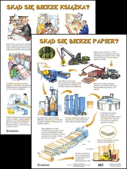 SKĄD SIĘ BIERZE PAPIER? / JAK POWSTAJE KSIĄŻKA?♦ format 61 cm x 86 cm♦ dwustronnie zalaminowane♦ wieloletnia trwałośćKto pisze książki, a kto czuwa nad ich wydaniem? Czym zajmują się redaktorzy językowi i techniczni? Skąd w książce biorą się ilustracje? Na czym polega mechanizm drukowania książki? Tego wszystkiego dzieci dowiedzą się z pierwszej strony planszy. Z kolei na drugiej stronie będą mogły obserwować krok po kroku proces produkcji papieru. Poznają odpowiedzi na pytania: z czego i gdzie wytwarza się papier, jakich maszyn się do tego używa, jakie są poszczególne etapy pracy, zanim do naszych rąk trafi arkusz papieru. Planszę można wykorzystać na każdym etapie nauki: zarówno w przedszkolu, klasach 1-3, jak i na lekcjach przyrody.