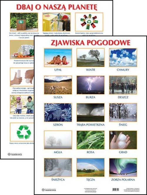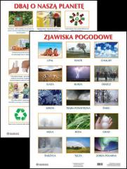 Prezentujemy Państwu plansze edukacyjne dla przedszkoli i klas 1-3. Jest to zestaw pomocy dydaktycznych, które przydadzą się w każdej klasie i sali przedszkolnej.Tematyka plansz jest zgodna z programem nauczania i dotyczy rzeczy bliskich dziecku. Dzięki wyrazistym ilustracjom i zdjęciom tablice w przyjazny sposób przedstawiają realia naszego świata. Poszczególne wzory sprawdzą się w dekorowaniu klasy lub pokoju dziecka, zwłaszcza jeśli ma już ono swoje zainteresowania.Plansza ta pozwoli lepiej poznać przyrodę i sposoby dbania o nią. Zdjęcia przedstawiają piętnaście zjawisk pogodowych. Druga plansza to piętnaście rzeczy, które możemy zrobić dla naszej planety. Dzięki jasnej wymowie zdjęć można nawet małe dziecko nauczyć podstaw ekologii.