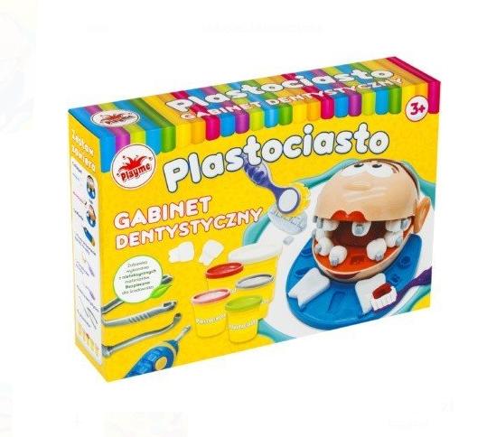 Zestaw masy plastycznej Plastociasto od Playme do zabawy w dentystę. Gabinet dentystyczny to zabawka, która pomoże Twojemu dziecku oswoić się z nielubianą ale niezbędną czynnością, jaką jest wizyta u stomatologa. Opakowanie zabawki zawiera: 4 małe tuby masy Plastociasto, 1 duża tubka masy, pacjenta do leczenia ząbków, akcesoria: wiertło, szczypce, szczoteczka do zębów, lusterko, forma do tworzenia aparatu na zęby