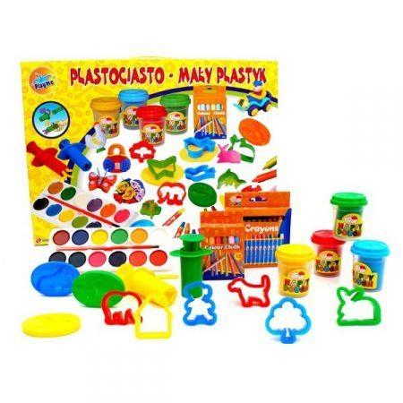 1 wyciskarka, 2 wałki, 2 linijki z otworami o różnych kształtach, 1 szpatułka, 1 forma, 1 mata, 1 pojemnik z plastociastem z brokatem, 4 pojemniki z plastociastem