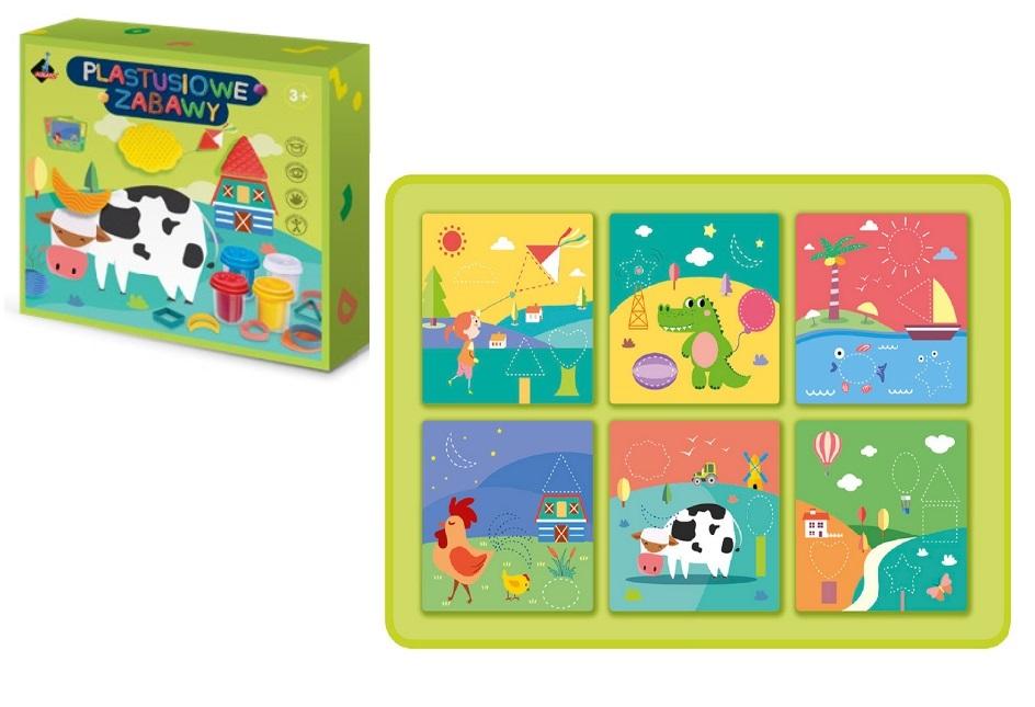 Opis produktuZasady bezpieczeństwaZabawa masą plastyczną pobudza wyobraźnię i kreatywność jak również poprawia koordynację wzrokowo-ruchową. Ugniatanie i formowanie "ciasta" rozwija zdolności motoryczne dziecka, tak przydatne podczas pisania czy rysowania, a szczypanie, ściskanie oraz wałkowanie masy stymuluje zmysł dotyku. W zestawie: 6 obrazków, 4 kolory masy plastycznej (4x55g), 8 foremek, nożyk, 4 płytki do odcisków, kolorowa książeczkę z pomysłami wykonania. x