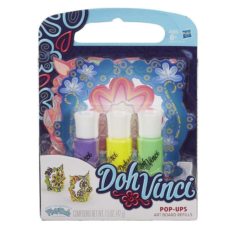 Dodaj koloru swojej palecie barw Doh Vinci! Każda z tych trzech jaskrawych tub ma inny kolor. Dodaj je do dowolnego zestawu Doh Vinci (sprzedawane oddzielnie) i twórz dzieła sztuki!