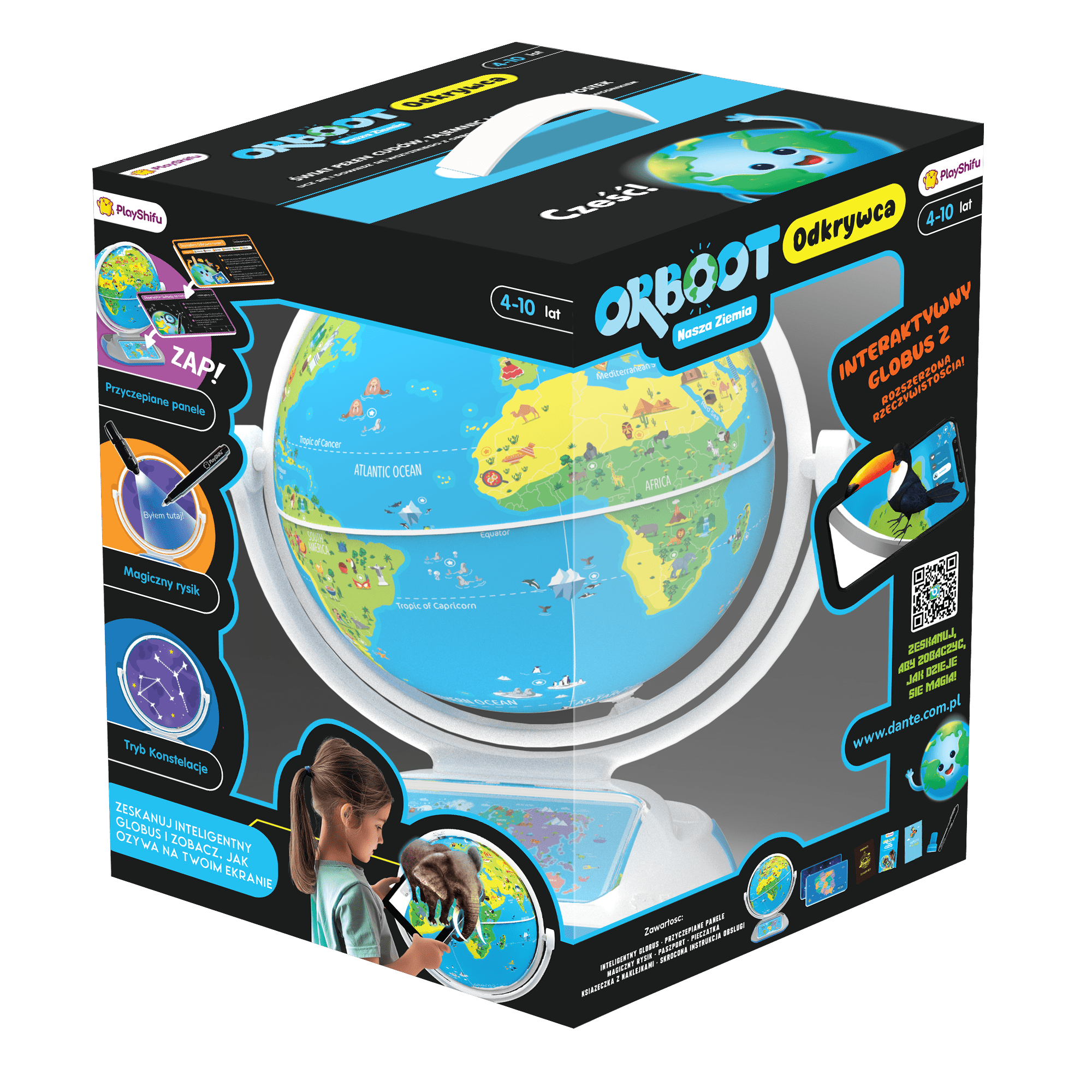 Opis produktuZasady bezpieczeństwaZestaw zawiera kolorowy globus z obrazkami, książeczkę z naklejkami i paszport, w którym młody odkrywca zapisze listę swoich ulubionych miejsc na świecie. Pobierz aplikację Orboot Earth, zainstaluj na swoim urządzeniu, a następnie ciesz się nauką przez zabawę. Zeskanuj wybrane elementy graficzne na globusie i patrz, jak ożywają na Twoim ekranie! x