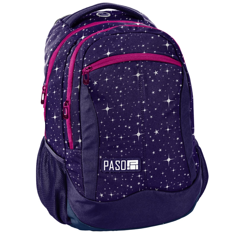 Plecak młodzieżowy, szkolny. Dwie pojemne komory, kieszeń przednia, 2 boczne kieszenie z siatki. Wzmocnione profilowane plecy, miękkie wygodne szelki. Wygodny uchwyt do przenoszenia i uszko do powieszenia. W komorze głównej przegroda (na laptop), w drugiej komorze organizer z kieszenią na zamek, uchwyt na klucze. Elementy odblaskowe dla większego bezpieczeństwa.