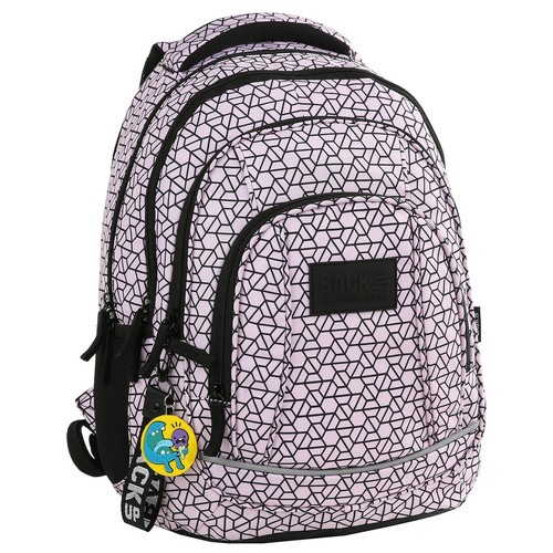 Szkolny plecak BackUP model A 02 w ciekawe geometryczne wzory, pastelowy jasny róż stonowano czernią. Gumowa naszywka z logo BackUp nadaje plecakowi ciekawego designu.