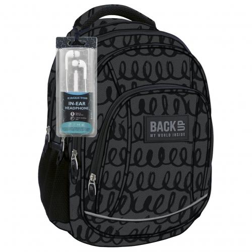 Szkolny plecak BackUP model A gdzie esy floresy, w bardzo stonowanych kolorach grafitu i czerni wykończone zostały równie dyskretnym logo.