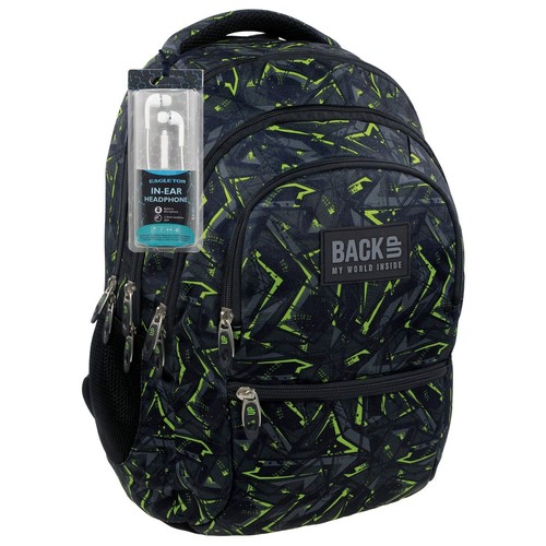 Szkolny plecak BackUP model C w geometryczne zielono szare wzory na czarnym tle. W zestawie słuchawki - gratis.