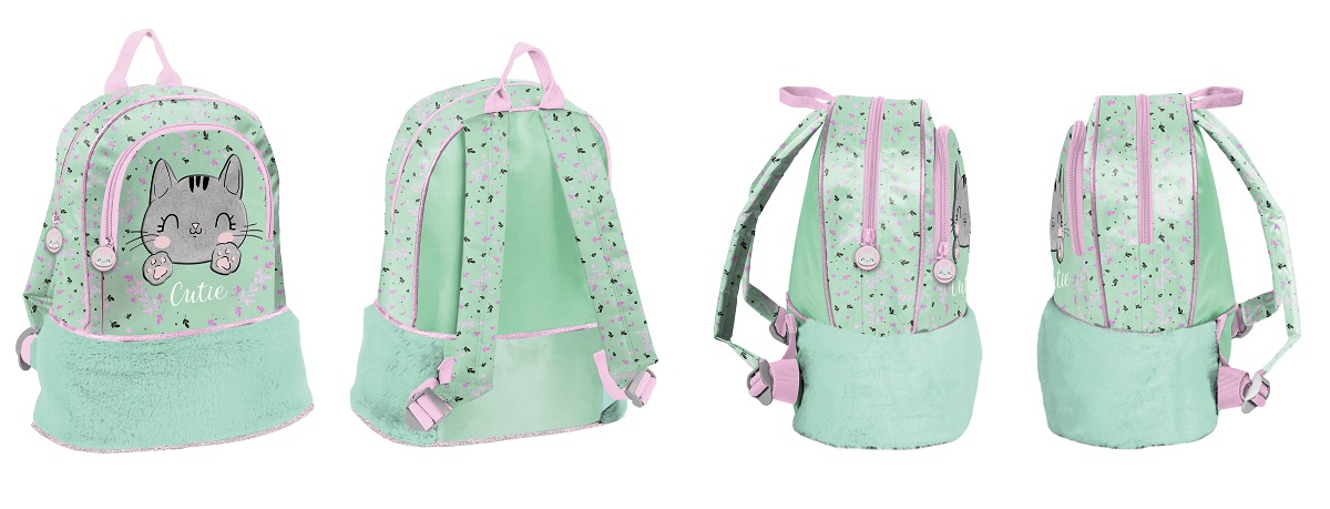 Obie części oddzielone brokatowym pipingiem. Jedna komora główna zapinana na zamek, jedna przednia kieszeń zapinana na zamek, wyściełany pasek na ramię, uchwyt do noszenia. Na froncie plecaka brokatowe wstawki i welurowa naszywka z kotkiem, brokatowe bizy. x