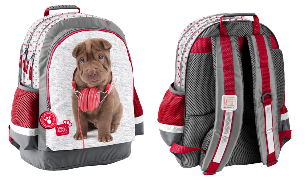 Plecak szkolny z dwoma komorami dużymi, dwoma kieszeniami na przodzie, bocznymi kieszonkami z siatki. Usztywnione, ergonomiczne wyprofilowane plecy i szelki. Plecy i szelki pokryte miękkim materiałem. Usztywnione dno. Elementy odblaskowe.