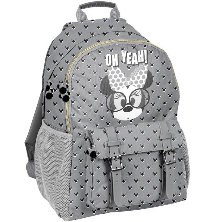 Plecak szkolny Minnie. Wyposażony w dwie pojemne komory oraz boczne kieszonki wykonane z siatki na bidon lub termos. Na froncie znajduje się zamykana na zamek kieszeń z dodatkowymi ozdobnymi klamrami zapinanymi na magnes. Plecak posiada wzmocnione, profilowane plecy oraz miękkie, regulowane szelki. Wygodne uszko do powieszenia lub trzymania sprawdza się w codziennym użytkowaniu. Ozdobne pullery ułatwiają otwieranie zamków.