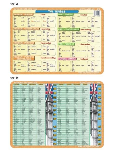 Dwustronna podkładka edukacyjna - prezentujezagadnienia z zakresu: the past tense, the present tense, irregular verbs. Format 40 x 30 cm. Usztywniona, ale jednocześnie elastyczna, dwustronnie foliowana. Wchodzi w skład zestawu 60 podkładek edukacyjnych zawierających kilkaset tematów pomocnych w utrwalaniu wiedzy, rozwijaniu zainteresowań, w nauce oraz zabawie.