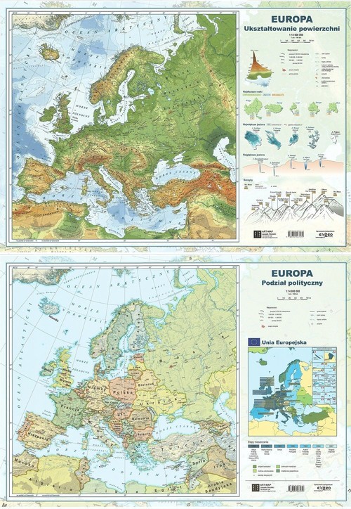 Dwustronna podkładka na biurko. Obustronnie laminowana, zawiera mapę Europy z podziałem politycznym oraz mapę ukształtowania terenu Europy. Można po niej pisać pisakiem suchościeralnym.