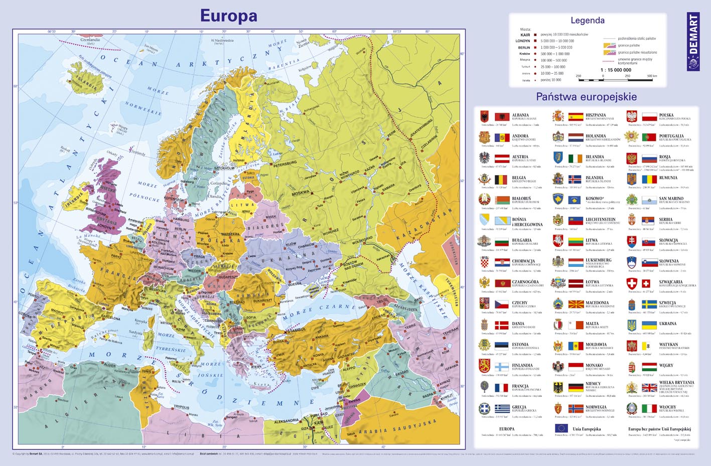 Opis produktuZasady bezpieczeństwaMapie z podziałem politycznym Europy w skali 1 : 15 000 000 towarzyszą symbole wszystkich europejskich państw (flagi i herby) oraz informacje o ich powierzchni i liczbie ludności. Podkładka z taką treścią pomoże w opanowaniu nazw krajów i ich stolic, rozmieszczenia na kontynencie względem innych państw i dostępności lub jej braku do morza czy oceanu, zapamiętaniu sąsiedztwa i relacji wielkości powierzchni poszczególnych krajów. x
