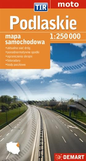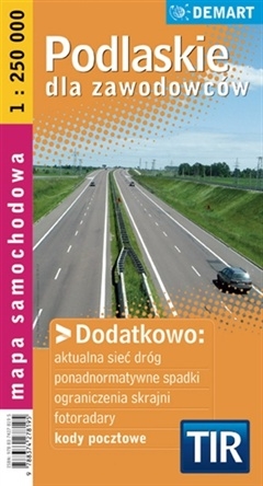 Mapa Podlaskie dla zawodowców TIRSkala 1:250 000Dodatkowo:- aktualna sieć dróg- ponadnormatywne spadki- ograniczenia skrajni- fotoradary- kody pocztowe
