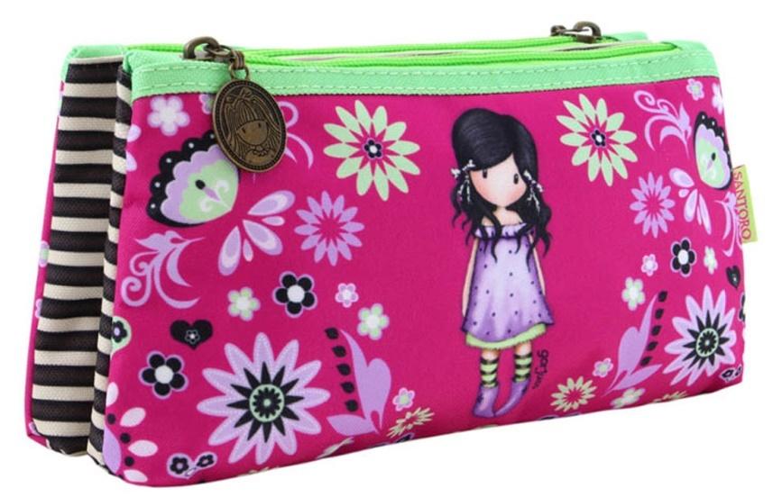 Podwójny piórnik - Gorjuss - You Brought Me Love. Podwójny piórnik ozdobiony grafiką egzotycznych kwiatów w delikatnych odcieniach magenty, bzu i limonki. Zawiera dwie zapinane na suwak kieszenie. Suwak ozdobiony medalionem w stylu antycznego mosiądzu z główką dziewczynki Gorjuss. Zmieszczą się w nim zarówno ołówki i długopisy, a także przybory do szycia czy inne drobiazgi. Wykonany ze szczególną dbałością. Wewnątrz posiada ciekawy wzór w stylowe paski. Wspaniały prezent do szkoły lub pracy.