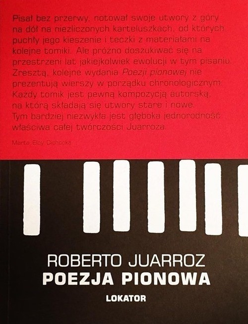 „Najlepsze, co poeta może powiedzieć, jest w jego poezji.” Roberto Juarroz tworzył poezję „pionową”, po prostu. Pisał bez przerwy, notował swoje utwory z góry na dół na niezliczonych karteluszkach, od których puchły jego kieszenie i teczki z materiałami na kolejne tomiki. Ale próżno doszukiwać się na przestrzeni lat jakiejkolwiek ewolucji w tym pisaniu. Zresztą, kolejne wydania Poezji pionowej nie prezentują wierszy w porządku chronologicznym, zgodnie z latami powstawania: przeciwnie, każdy tomik jest pewną kompozycją autorską, na którą składają się utwory stare i nowe. Tym bardziej niezwykła jest głęboka jednorodność właściwa całej twórczości Juarroza.