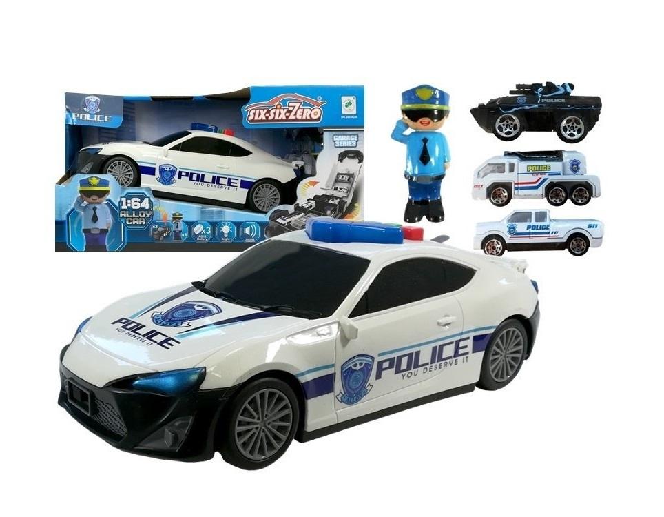 Opis produktuZasady bezpieczeństwaDzieci od zabawkowych pojazdów policji wymagają zazwyczaj bardzo dużo. Czy posiada świecące koguty? Czy posiada działającą syrenę? Czy ma jakieś ciekawe funkcje? Na wszystkie te pytania można odpowiedzieć twierdząco, jeśli wybrano Policyjny Pojazd Transporter. Policyjny samochód utrzymany jest w kolorach białym i niebieskim z czarnymi szybami wyglądającymi jak przyciemniane. Reflektory pojazdu pokryte są farbą koloru kobaltowego, a koguty wykonane są z półprzezroczystego, niebieskiego plastiku. Na dachu pojazdu znajdują się 4 różnokolorowe przyciski - każdy z nich odpowiada za inny odgłos syreny policyjnej. Skąd jednak pochodzi nazwa Transporter? Otóż z przodu samochodu znajduje się przełącznik, za pomocą którego można podnieść całą karoserię autka odsłaniając przestrzeń, w której można umieścić dołączone do zestawu dodatki. Akcesoria, które można znaleźć w zestawie to 3 pojazdy służb specjalnych - opancerzony pojazd z działkiem, biały wóz strażacki i policyjny Pick-Up. W zestawie znajduje się także figurka funkcjonariusza policyjnego. Samochód osadzony jest na 4 kołach, które swobodnie się kręcą, przez co można bawić się bezproblemowo na większości gładkich powierzchni. Zabawka wykonana jest z twardego, lecz sprężystego plastiku, co redukuje ryzyko pęknięcia jego elementów. Wymiary pojazdu: 29 cm x 13 cm x 9,5 cm Wymiary dołączonych pojazdów: 7 cm x 3 cm x 3 cm Samochód Transporter Policji wyposażony jest w baterie, dzięki czemu jest gotowy do zabawy już po wyciągnięciu z pudełka. Ze względu na niewielkie elementy, zestaw nie jest przeznaczony dla dzieci poniżej 3 roku życia. x