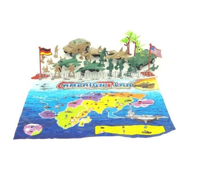 Pojazdy w worku, w zeatawie mapa, figurki zołnierzy i pojazdów.