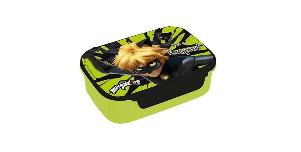 Pojemnik na śniadanie. Wykonany z plastiku - dolna część jednokolorowa, górna - wieczko z wielokolorowym nadrukiem. Zamknięcie plastikowe/zatrzaskowe podwójne na dłuższych bokach. Nie jest dostosowany do podgrzewania w mikrofalówce, ani do mycia w zmywarce. Szerokość: 17,5 cm