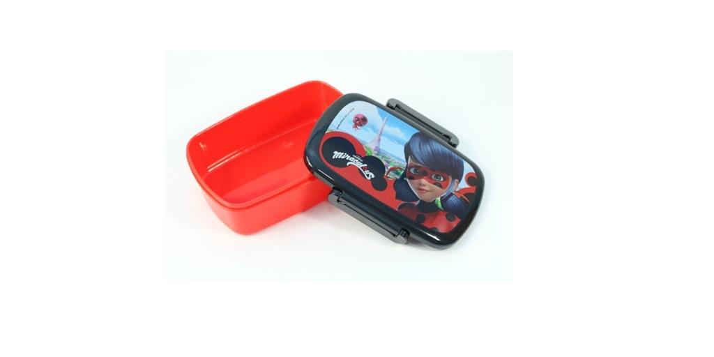 Pojemnik na śniadanie. Wykonany z plastiku - dolna część jednokolorowa, górna - wieczko z wielokolorowym nadrukiem. Zamknięcie plastikowe/zatrzaskowe podwójne na dłuższych bokach. Może służyć również do przechowywania drobiazgów. Nie jest dostosowane do podgrzewania w mikrofalówce, ani do mycia w zmywarce. Szerokość: 17,5 cm