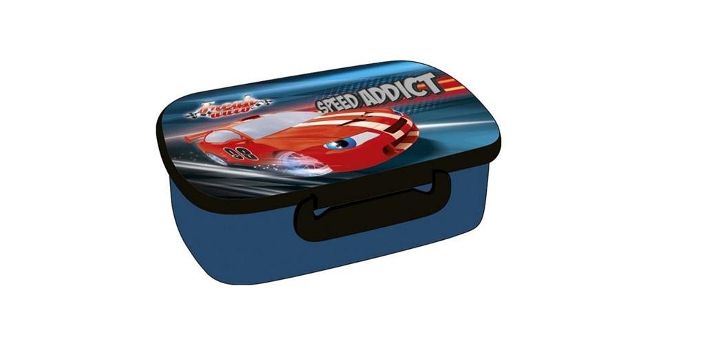 Pojemnik na śniadanie. Wykonany z plastiku - dolna część jednokolorowa, górna - wieczko z wielokolorowym nadrukiem. Zamknięcie plastikowe/zatrzaskowe podwójne na dłuższych bokach. Może służyć również do przechowywania drobiazgów. Nie jest dostosowane do podgrzewania w mikrofalówce, ani do mycia w zmywarce. Szerokość: 17,5 cm