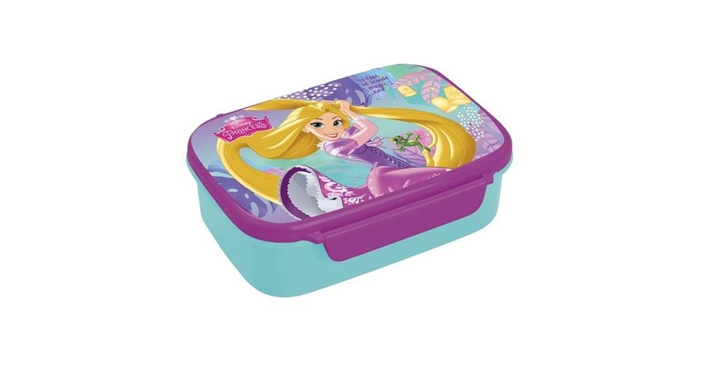 Pojemnik na śniadanie. Wykonany z plastiku - dolna część jednokolorowa, górna - wieczko z wielokolorowym nadrukiem. Zamknięcie plastikowe/zatrzaskowe podwójne na dłuższych bokach. Może służyć również do przechowywania drobiazgów. Nie jest dostosowane do podgrzewania w mikrofalówce, ani do mycia w zmywarce. Szerokość: 17,5 cm