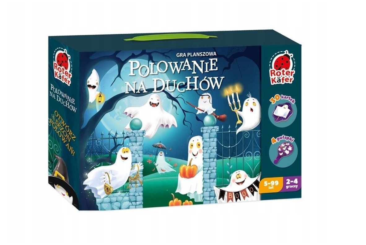 Sezon polowania na duchy ogłaszamy za otwarty! Zbierz nieustraszony zespł, zaopatrzcie się w pułapki i naprzd! Będziecie musieli złapać wszystkie duchy przedstawione na waszych pułapkach. Wygra ten, kto zrobi to jako pierwszy! Ale bądźcie ostrożni. Nie możecie polować na duchy, ktrych nie ma na waszej pułapce. Jeżeli przypadkowo przykryjecie je pajęczynką, będziecie musieli zwrcić jednego własnego wcześniej złapanego ducha. Gra planszowa gwarantuje wesołą zabawę, a także ćwiczy koncentrację, spryt, szybkość reakcji i nawyki komunikacyjne. Zestaw: 30 elementw, 4 pułapki, woreczek, instrukcja.