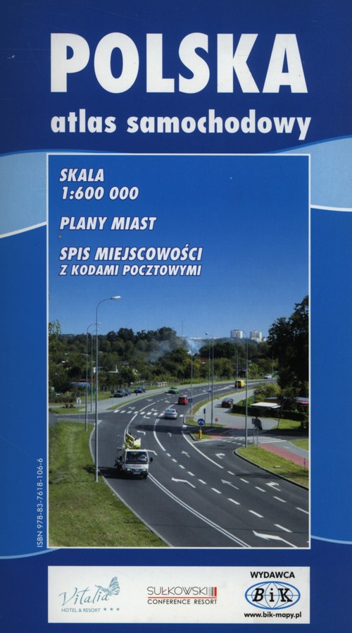 Dokładne mapy Polski w skali 1:600 000, 18 planów większych miejscowości ,spis miejscowości z kodami pocztowymi.