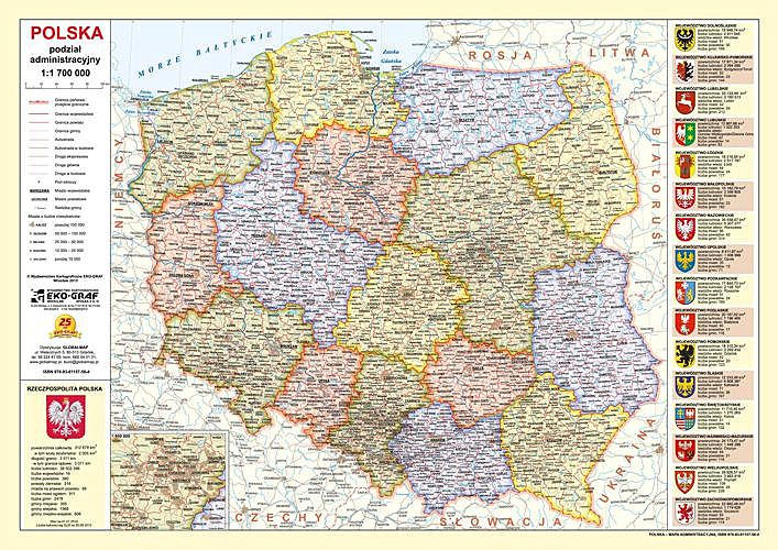 Fizyczno-administracyjna podkładka z mapą Polski Na mapie fizycznej zaznaczono barwnie krainy geograficzne wraz z ukształtowaniem terenu. Dodatkowo zawiera granice Państwa, przejścia graniczne, autostrady i autostrady w budowie, drogi ekspresowe, drogi główne, drogi w budowie, parki narodowe, porty lotnicze oraz podziałkę wysokości.