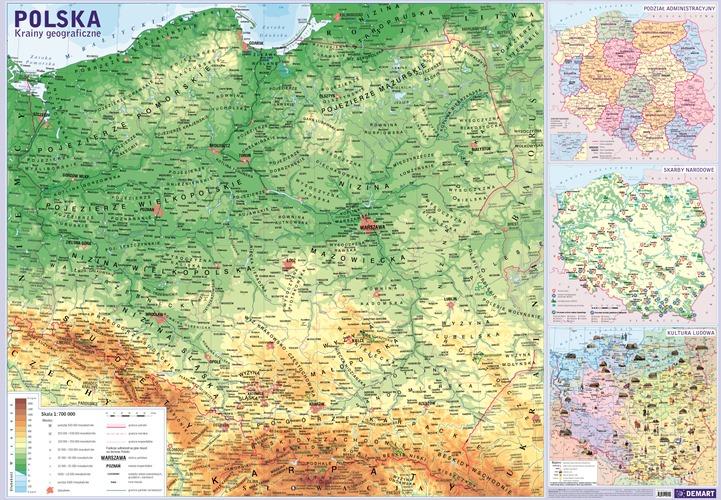 Polska - mapa ścienna w skali 1 : 1 700 000 - fizyczno-administracyjna. Oprócz szczegółowego barwnego obrazu ukształtowania powierzchni zawiera sieć rzeczną i jeziora, opisy krain geograficznych, wszystkie miasta i dużą liczbę wsi gminnych, oraz granice państw i województw
