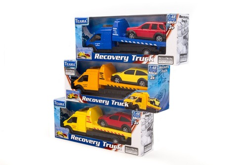 Metalowy model samochodu pomocy drogowej z autem na lawecie w skali 1:48