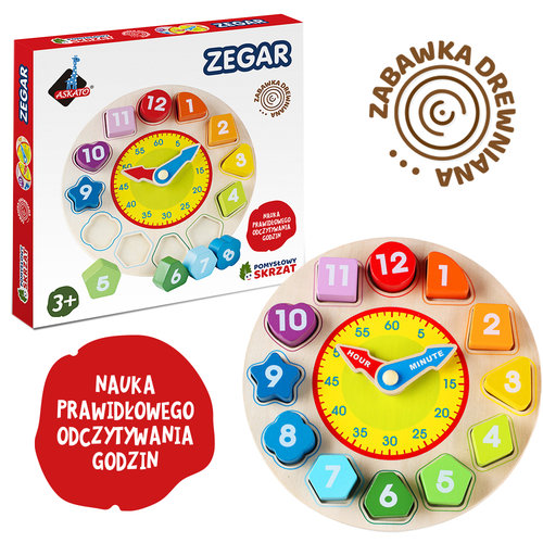 Ten barwny zegar do nauki oferuje masę dodatkowych rzeczy do odkrycia. Zabawka ma wyciągane elementy, w kształcie różnych figur, które maluch może odpowiednio dopasować na miejsca oraz cyferki na drewnianych klockach.