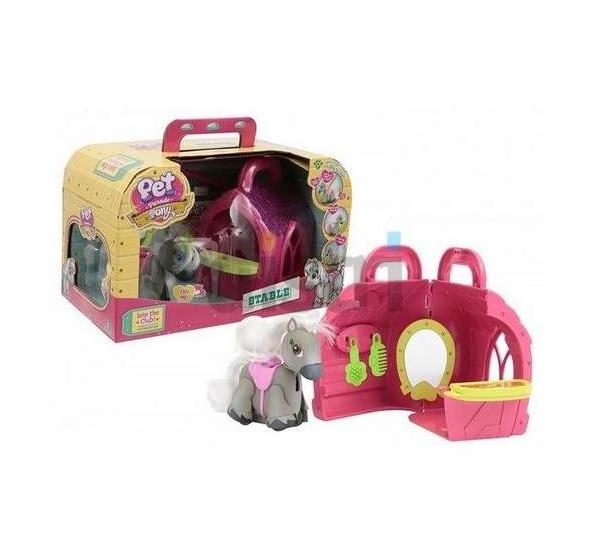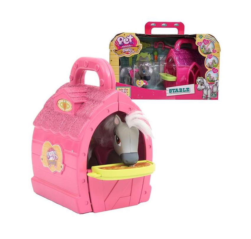 PONY PARADE, to linia zabawek, która łączy dziewczęcą miłość do Kucyków z innowacyjnymi funkcjami produktu, zapewniając wspaniałą zabawę! Naciśnij przycisk na grzbiecie Kucyka i zobacz, jak porusza głową, ogonem, uszami a nawet chodzi! Kiedy zaczepisz mu lejce, chętnie pogalopuje na wybieg. Każdy Kucyk zaopatrzony jest w dwa magnesy, dzięki którym możliwa jest interakcja z akcesoriami. Kucyka można zabierać wszędzie ze sobą, dzięki specjalnemu kuferkowi w kształcie boxu dla konika. Zaopiekuj się Kucykiem z najnowszej serii PONY PARADE i baw się z nim do woli. Każdy Kucyk posiada identyfikator w kształcie podkowy, na którym dziewczynka może zapisać imię swojego ulubieńca. Zestaw Pony Parade Kuferek z konikiem zawiera: - konika - lejce - siodło - przenośny, rozkładany box dla konika - inne akcesoria x