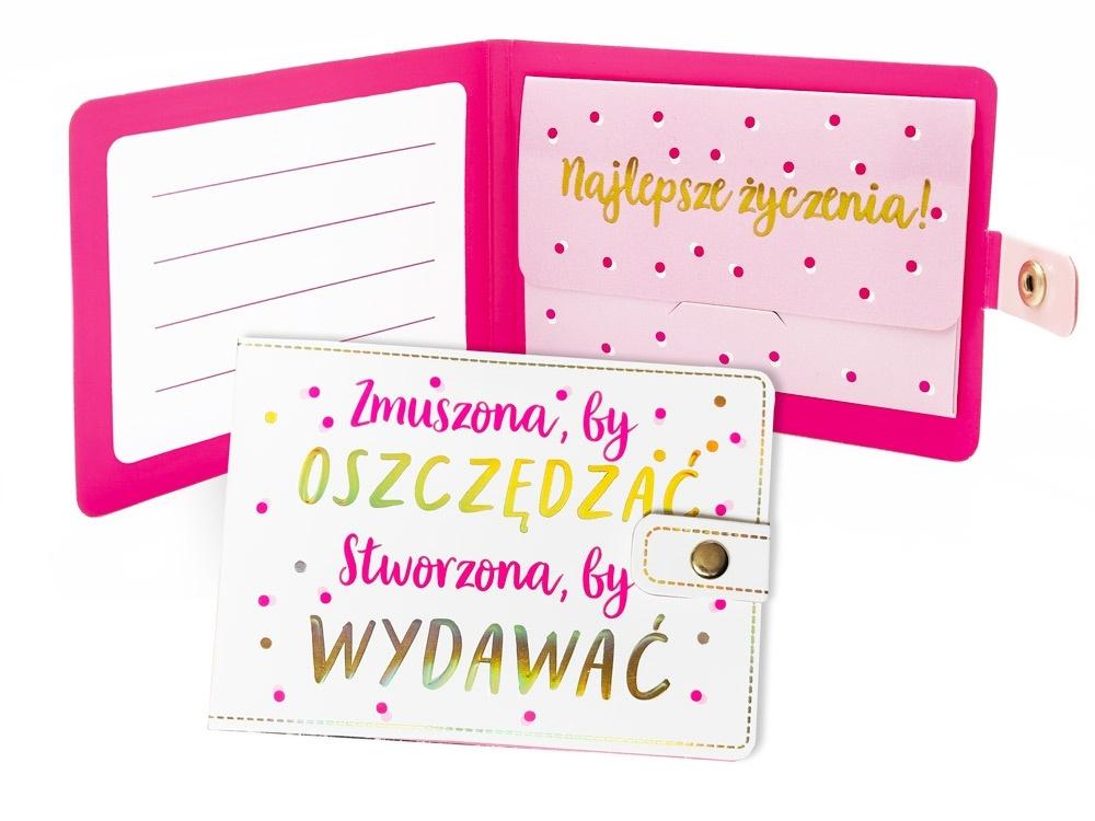 Opis produktuZasady bezpieczeństwaPortfelik POR-007 "Zmuszona, by oszczędzać. Stworzona, by wydawać" Portfeliki z życzeniami to alternatywa dla tradycyjnych kartek, są wyjątkowym sposobem na podarowanie bliskiej osobie banknotu. Portfeliki są kolorowe i uszlachetnione metalizowaną folią hot-stamp, oraz są wyposażone w zamknięcie na zatrzask, co umożliwia ich wielokrotne otwieranie i zamykanie - jak w prawdziwym portfelu. Portfeliki zawierają niebanalne teksty oraz życzenia w środku. Specyfikacja: wymiary: 11 x 8 cm (po złożeniu) wnętrze: życzenia w środku waga: 13 g okazja: ogólne życzenia x