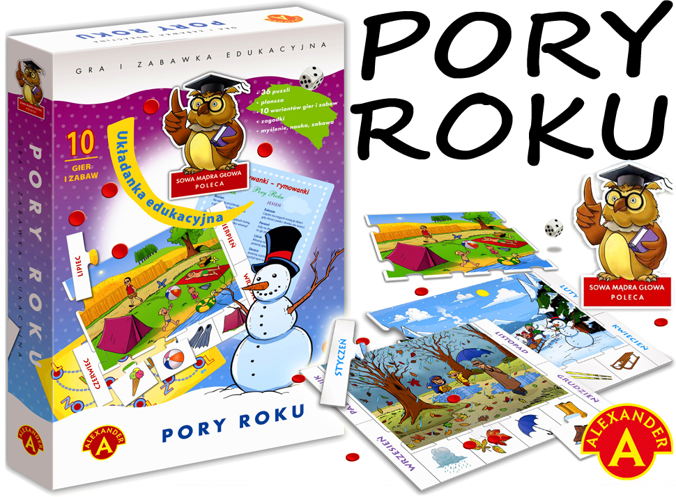 "Pory roku" to różne warianty gier i zabaw, które utrwalają umiejętności rozpoznawania i nazywania pór roku, czasu ich trwania, umiejętność przyporządkowywania elementów do odpowiednich pór roku i umiejętność wypowiedzi, koncentrację, logiczne myślenie, pamięć, wyobraźnię oraz sprawność manualną. Dzieci mogą bawić się indywidualnie lub w większym gronie. Zawartość pudełka: 36 puzzli, plansza, pionek, kostka, karta zagadek, 40 żetonów, instrukcja.