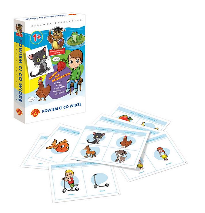 Opis produktuZasady bezpieczeństwaZestaw składa się 32 plansz z obrazkami przedstawiającymi obiekty z najbliższego otoczenia dzieci. Dzięki odpowiednio zadawanym pytaniom stymulujemy naukę mowy oraz ćwiczymy poprawne budowanie wypowiedzi. Zabawka pomaga w nauce nazywania rzeczy, czynności, określania położenia oraz cech przedmiotów, odróżniania liczby pojedynczej od mnogiej oraz tworzenia odpowiedniej formy gramatycznej wypowiedzi. Zawartość opakowania