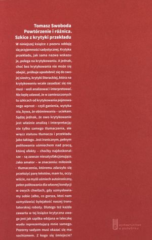 Analizując polskie tłumaczenia utworów z literatury francuskiej, hiszpańskiej i latynoamerykańskiej, autor omawia elementy warsztatu translatorskiego, wskazuje -- na przykładach -- aspektyi warstwy tekstu, które w trakcie pracy tłumacz powinien brać pod uwagę. Szkice Swobody dotykają najważniejszych zagadnień teorii przekładu, takich jak kwestia wierności oryginałowi i konieczności dostosowania strategii przekładowej do charakteru tłumaczonego dzieła oraz intertekstualności literatury współczesnej. Rozdziały poświęcone takim twórcom jak Francis Ponge, Raymond Queneau, Maurice Blanchot i Emil Cioran są ponadto systematycznym opracowaniem translatorskiej recepcji ich dzieł na gruncie polskim.