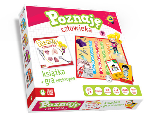 Poznaję człowieka to zestaw edukacyjny przeznaczony dla dzieci 4-6-letnich. Składa się z książki z ćwiczeniami, będącymi uzupełnieniem edukacji wczesnoszkolnej, oraz gry tematycznej.W książce znajdują się zadania, z zabawnymi, kolorowymi ilustracjami. Dzięki dołączonej grze, dzieci utrwalają nabyte podczas ćwiczeń z książką umiejętności. Niewątpliwą zaletą gry jest również to, że może bawić się w nią cała rodzina. Książka i gra stanowią integralną całość. Doskonałe w edukacji domowej.W Poznaję człowieka dziecko razem z sympatycznymi bohaterami, Natalką i doktor Igiełką, poznaje ciało człowieka, to jak ono funkcjonuje oraz uczy się, jak o nie dbać. Ćwiczenia zaproponowane w książce nie polegają tylko na wypełnieniu zadań, ale często angażują wszystkie zmysły dziecka, podając również pomysły na ciekawe zabawy.Choć książka zawiera ćwiczenia, to dzięki interesującej narracji nie ma ona charakteru stricte szkolnego, co ułatwia naukę przez zabawę.