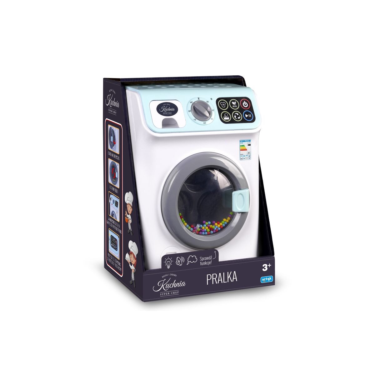 Funkcje: otwierany pojemnik na proszek, pokrętło do ustawienia temperatury, panel dotykowy, światło, dźwięk.