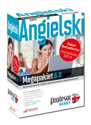 Pakiet 5 kursów językowych dla początkujących, średnio zaawansowanych i zaawansowanych. 8 płyt CD plus książka. Poziom kursu od A1 do C1. W Megapakiecie 6.0:- Profesor Henry 6.0 - słownictwo poziom 1 & 2- Profesor Henry 6.0 - słownictwo poziom 3 & 4- Profesor Henry 6.0 - rozumienie ze słuchu i konwersacje- Profesor Henry 6.0 - gramatyka- Angielski konwersacje (książka + CD MP3)Pakiet 5 kursów do kompleksowej i skutecznej nauki języka angielskiego dla początkujących, średnio zaawansowanych i zaawansowanych. Profesor Henry - Megapakiet 6.0 gwarantuje naukę aż 25 000 słów, zwrotów i zdań, dzięki multimedialnemu repetytorium przystępnie objaśnia gramatykę, a ponad 40 godzin nagrań native speakerów uczy rozumienia ze słuchu i prawidłowej wymowy. Siłą pakietu jest system powtórek - gwarancja efektywnej nauki! Nowością jest zaawansowany system rozpoznawania mowy.Profesor Henry 6.0 - słownictwo poziom 1 & 2, poziom 3 & 4Wszechstronnie i skutecznie uczą ponad 25 000 słów, zwrotów i zdań angielskich na poziomie od początkującego (A1) do zaawansowanego (C2). Siłą programów są urozmaicone ćwiczenia (aż 18 rodzajów) i system inteligentnych powtórek - gwarancja szybkiej i efektywnej nauki. Programy zawierają łącznie 25 000 wysokiej jakości nagrań rodowitych Brytyjczyków. Opcja nagrywania przez mikrofon uczy prawidłowej wymowy. Możliwość wydrukowania karteczek ze słówkami pozwala na powtórkę słówek i zdań w podróży, drodze do pracy czy szkoły.Profesor Henry 6.0 - rozumienie ze słuchu i konwersacjeKompleksowa nauka praktycznego posługiwania się współczesnym językiem angielskim. Ponad 100 filmów, nagrań i dialogów, o zróżnicowanej tematyce i z udziałem aż 16 native speakerów, uczy nie tylko rozumienia ze słuchu, lecz także pisania, mówienia i tłumaczenia. 1000 różnorodnych ćwiczeń sprawia, że praca z programem jest urozmaicona i skuteczna. Profesor przygotowuje do matury, FCE i CAE, w szczególności do części Listening Comprehension i Speaking.Profesor Henry 6.0 - gramatykaIlustrowane i w pełni udźwiękowione multimedialne repetytorium przystępnie objaśnia zagadnienia gramatyczne - wszystkie są zilustrowane przykładami użycia w praktyce. Materiał zawarty w kursie obejmuje cały zakres gramatyki wymagany na egzaminach FCE, CAE i maturze. Jego opanowanie ułatwiają urozmaicone ćwiczenia i system powtórek. NOWOŚĆ! Zaawansowany technologicznie system rozpoznawania mowy ocenia poprawność wypowiedzi i precyzyjnie wskazuje, w którym miejscu popełniany jest błąd. Program analizuje wymowę nawet pojedynczych głosek.Angielski konwersacjePakiet (Książka + CD MP3) przeznaczony jest dla osób początkujących i średnio zaawansowanych, którzy chcą doskonalić umiejętność prowadzenia swobodnych rozmów w języku angielskim. Jest szczególnie polecany w przygotowaniach do egzaminów ustnych. Obejmuje ponad 60 dialogów, naukę trudnych słówek i zwrotów oraz zestawy ciekawych ćwiczeń. Na płycie znajdują się ponad 3,5 godziny nagrań native speakerów, które zapoznają z prawidłową wymową oraz pomagają przećwiczyć rozumienie ze słuchu i uczyć się metodą powtarzania.