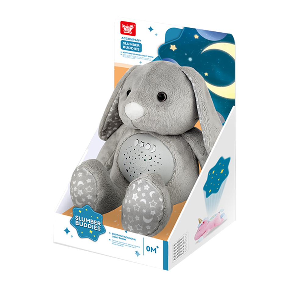 Opis produktuZasady bezpieczeństwaProjektor muzyczny - zajączek. Delikatne dźwięki muzyki, które można zmienić na szum fal. Kolorowy projektor, który wyświetla gwiazdki na ścianie lub suficie. Wymagane baterie - 2xAA (niedołączone). Wysokość zajączka - 34 cm. x