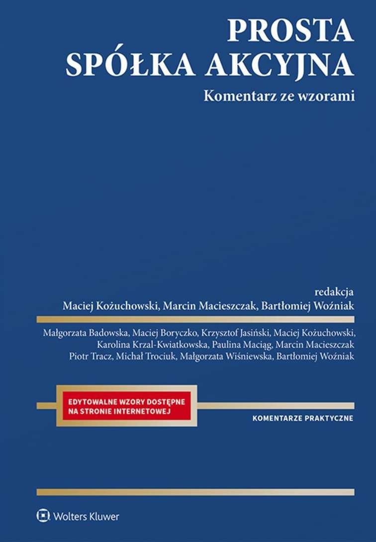 Wzory pism zawarte w publikacji są dostępne w wersji elektronicznej do pobrania ze strony: www.wzory-prosta-spolka-akcyjna.wolterskluwer.pl(Link do innej strony) – po wpisaniu zamieszczonego w książce kodu aktywacyjnego. Wzory można modyfikować i dostosowywać do własnych potrzeb.
