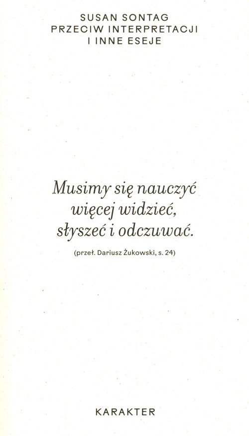 Zbiór głośnych esejów amerykańskiej intelektualistki. Opublikowany w 1966 roku, szybko stał się pozycją klasyczną i wywarł wielki wpływ na myślenie o współczesnej sztuce i kulturze. Sontag w oryginalny, a niekiedy i prowokacyjny jak na tamte czasy sposób pisze m.in. o twórczości Sartrea, Ionesco i Lvi-Straussea, analizuje filmy Godarda i Bressona, podejmuje temat wyobrażenia katastrofy w filmach science fiction czy też zagadnienia współczesnej myśli religijnej. W tomie znalazły się najbardziej znane teksty Sontag esej tytułowy oraz Zapiski o kampie, dowodzące jej niezwykłej wrażliwości na nowe zjawiska w kulturze. Jak zaznacza we wstępie sama autorka, wartością tych tekstów jest nie tyle krytyka poszczególnych dzieł, co istotność poruszanych problemów. Sontag pisze przenikliwie i z żarem, dając dowód na to, że cytując zakończenie tytułowego eseju nie potrzebujemy hermeneutyki, ale erotyki sztuki.
