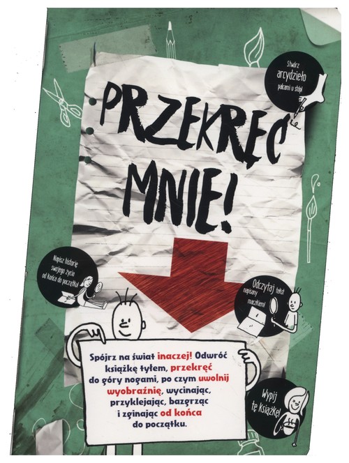 Chociaż PRZEKRĘĆ MNIE wygląda jak książka – (tak, wiemy, że nieco SZURNIĘTA)- nasza akżąisk jest na wspak nie tylko z nazwy, ale też z natury. Będziesz musiał(a) nieźle się nagimnastykować, żeby ją uzupełnić, więc wrzuć mózg na wsteczny, zapomnij o zdrowym rozsądku i narób bałaganu! Spójrz na świat inaczej! Odwróć książkę tyłem, przekręć do góry nogami, po czym uwolnij wyobraźnię, wycinając, przyklejając, bazgrząc i zginając od końca do początku.