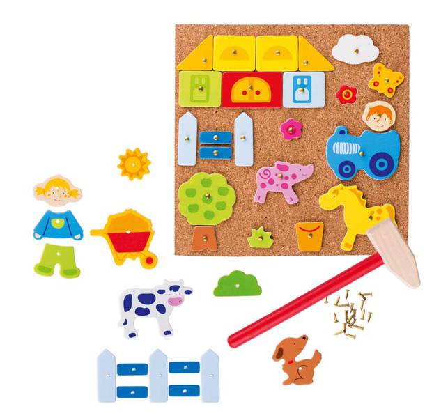 Zestaw do tworzenia historii o wiejskim życiu. Za pomocą młotka należy przybijać je do korkowej planszy, a powstaną obrazki, jakie tylko podpowie wyobraźnia.