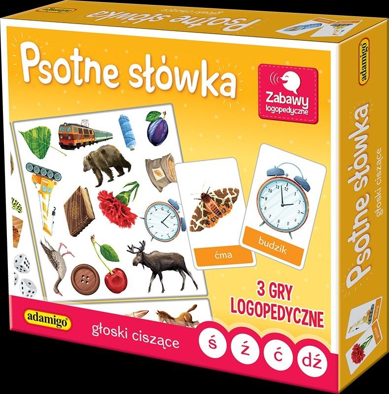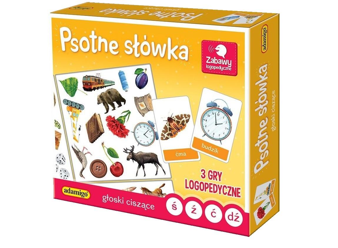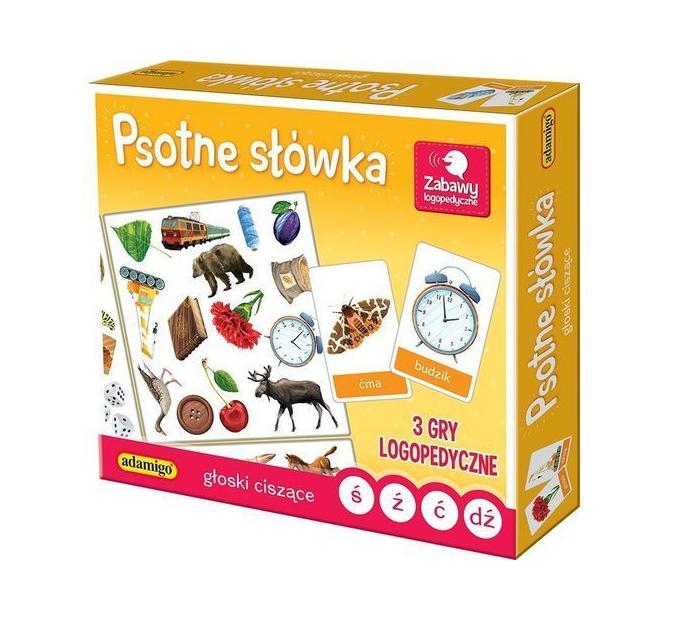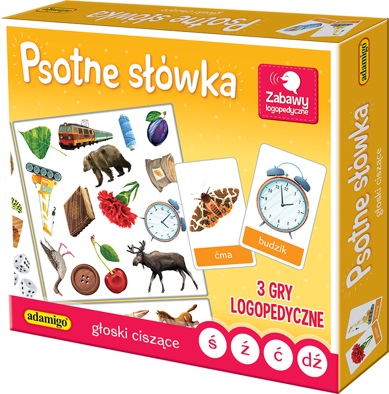 Opis produktuZasady bezpieczeństwaSeria gier PSOTNE SŁÓWKA przeznaczona jest dla wszystkich, którzy chcą doskonalić prawidłową wymowę trudnych głosek. Psotne polskie słowa często sprawiają najmłodszym wiele trudności. Dzięki grze ćwiczenia logopedyczne staną się przyjemnością. Każde dziecko wie już o tym, Słówka mogą robić psoty, Plączą język trudne słowa, Katastrofa więc gotowa. Jednak na to jest już rada, Ćwiczyć język wciąż wypada, Zagraj w grę dla przyjemności, A pokonasz te trudności! Zestaw zawiera: