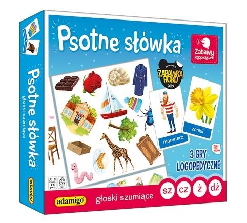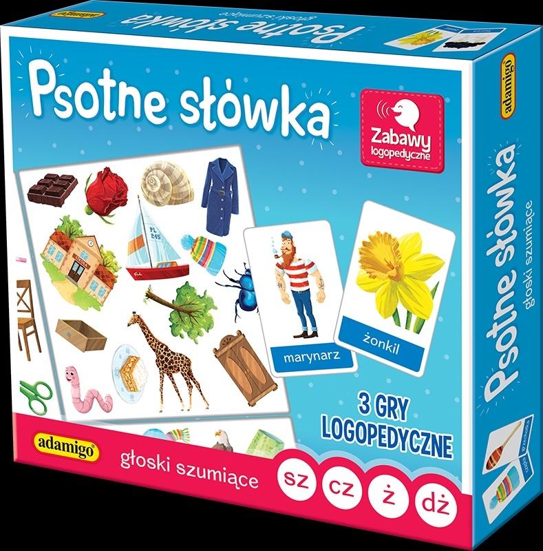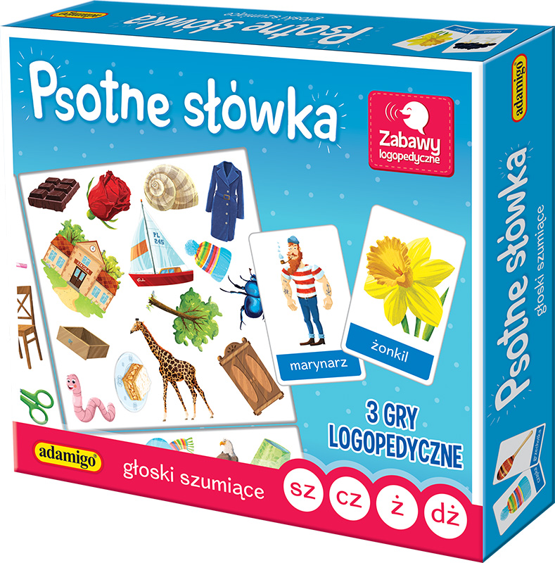 Opis produktuZasady bezpieczeństwaSeria gier PSOTNE SŁÓWKA przeznaczona jest dla wszystkich, którzy chcą doskonalić prawidłową wymowę trudnych głosek. Psotne polskie słowa często sprawiają najmłodszym wiele trudności. Dzięki grze ćwiczenia logopedyczne staną się przyjemnością. Każde dziecko wie już o tym, Słówka mogą robić psoty, Plączą język trudne słowa, Katastrofa więc gotowa. Jednak na to jest już rada, Ćwiczyć język wciąż wypada, Zagraj w grę dla przyjemności, A pokonasz te trudności! Zestaw zawiera: