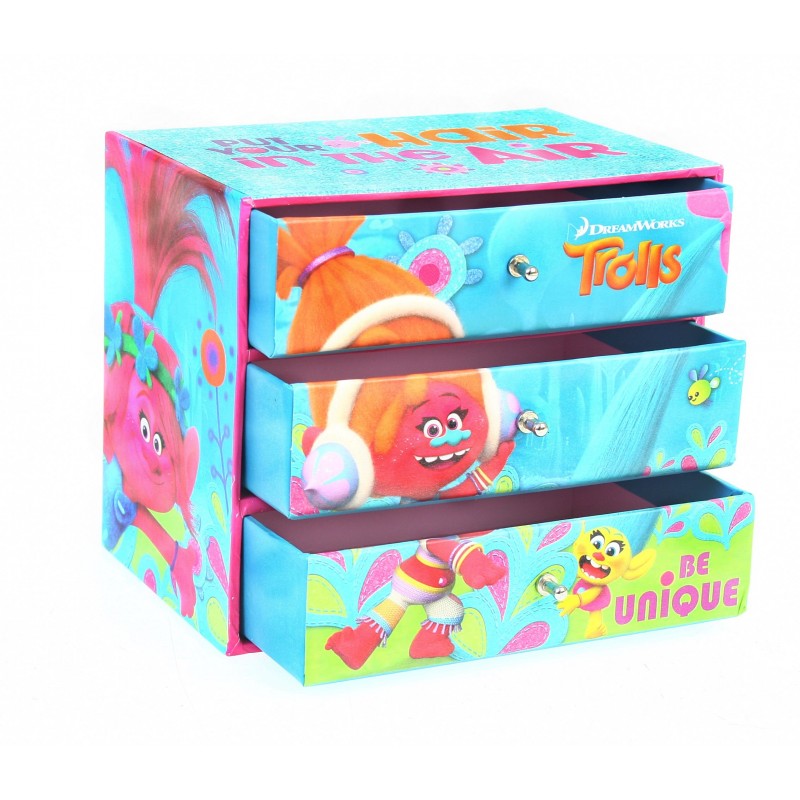 Opis produktuZasady bezpieczeństwaPudełko na biżuterię Trolls o wymiarze: dł. 13 cm, szer. 9 cm, wys. 12 cm z trzema szufladkami. Każda szufladka o wymiarze: dł. 13,5 cm, szer. 8,5 cm, wys. 3,5 cm z metalowym grzybkiem do otwierania. Pudełko wykonane jest z kartonu pokrytego grafiką z bajek Trolls z nadrukiem ulubionych bohaterek na wieczku i szufladkach. Wewnątrz pudełka karton wykończony został różowym kolorem. x