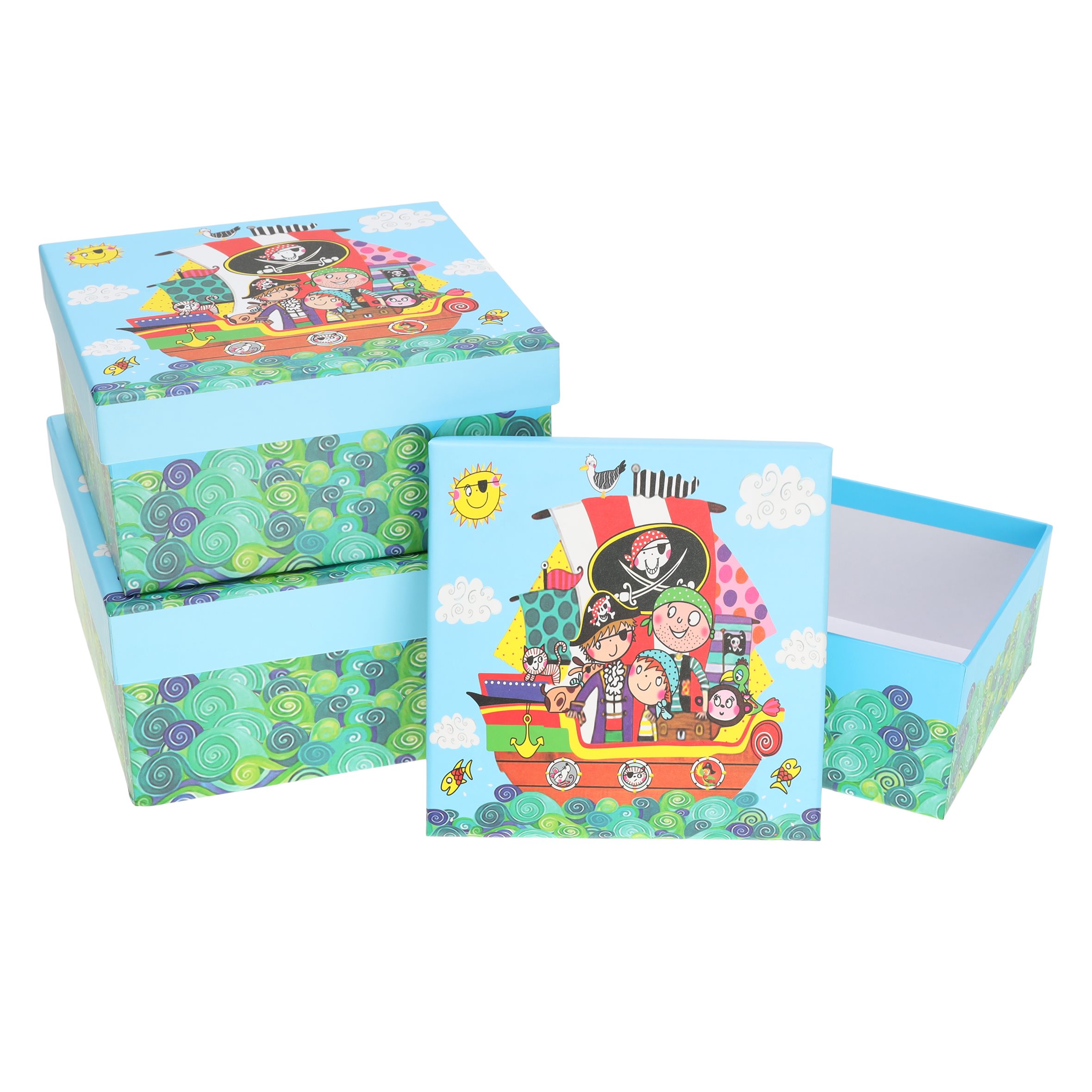 Opis produktuZasady bezpieczeństwaPudełko prezentowe dziecięce 3szt piraty ROZETTE Rozmiar: S: 15,5x15,5x7,5 cm M: 18x18x8,5 cm L: 20x20x9,5 cm x
